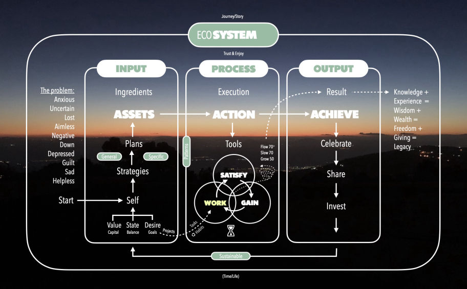 The outputs within this system are the result of the processed inputs. They come in the form of attaining bonus lifestyle goals such experience, freedom, wisdom and knowledge, or desired goals like raising a happy family, establishing a successful business, buying a property, or traveling the world.